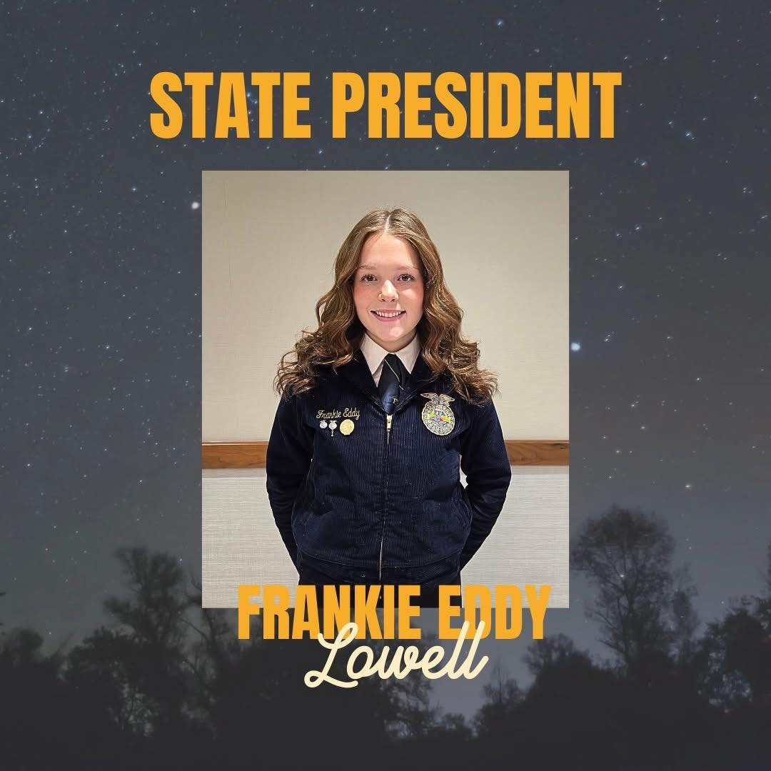 Eddy’s election is a historic moment for the Lowell FFA chapter. The last Lowell student elected State President was David Hildenbrand in 1993. Eddy also becomes the first female State President from Lowell and the first Lowell student to serve as a state officer since Maria Blough was Region V State Vice President in 2015–2016.