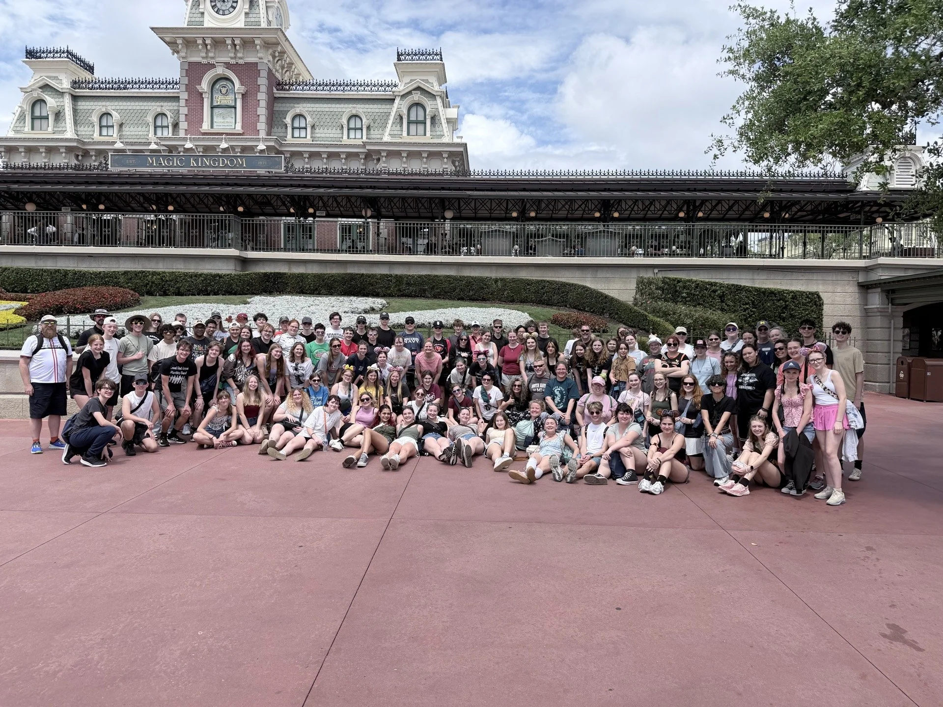 The whole crew! Lowell’s music students at the entrance of Magic Kingdom. Photo by Dan Scott.