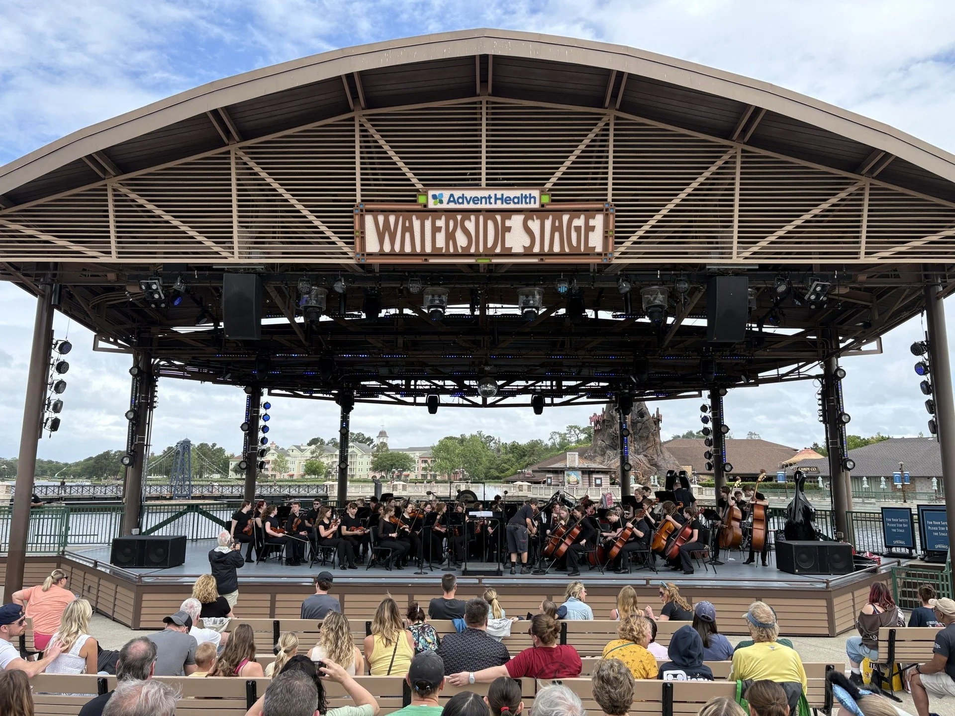 Each group participated in different aspects of the program. Orchestra students performed on a stage at Disney Springs and also took part in a combined band and orchestra workshop at EPCOT focused on film music and recording.